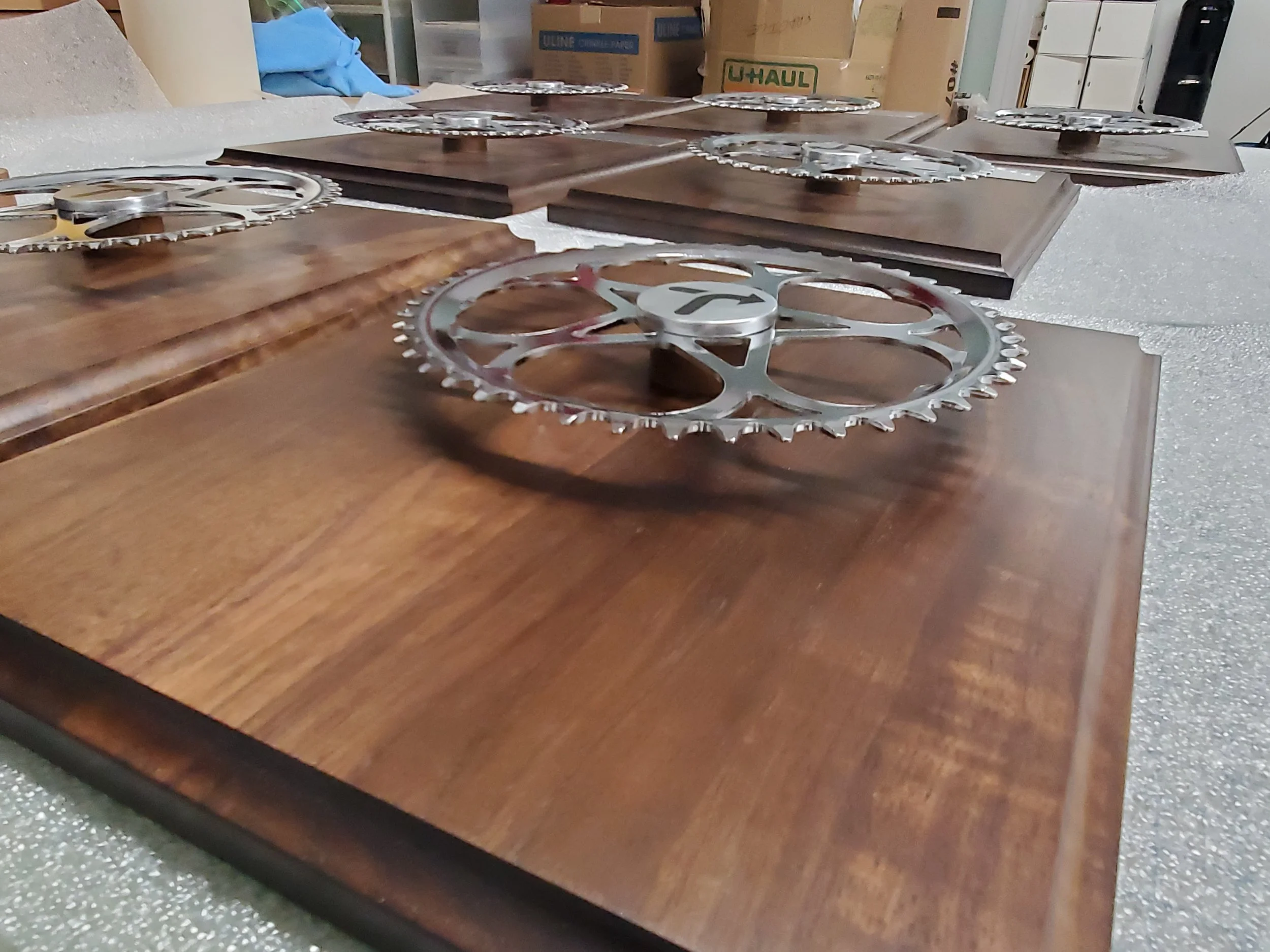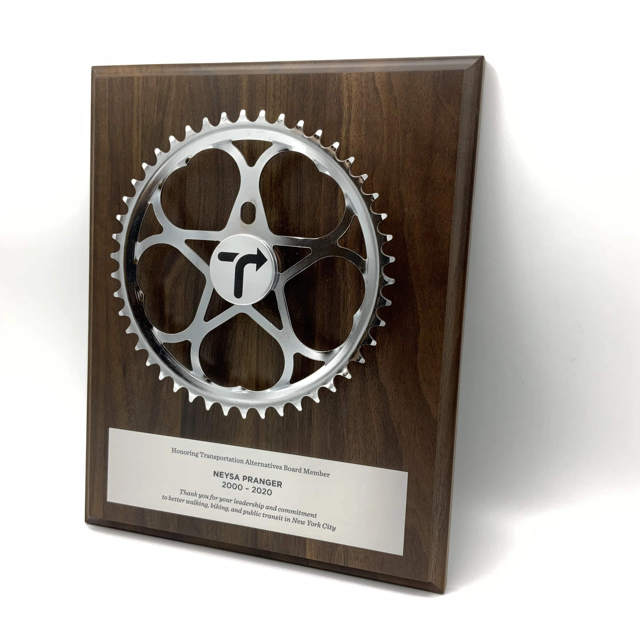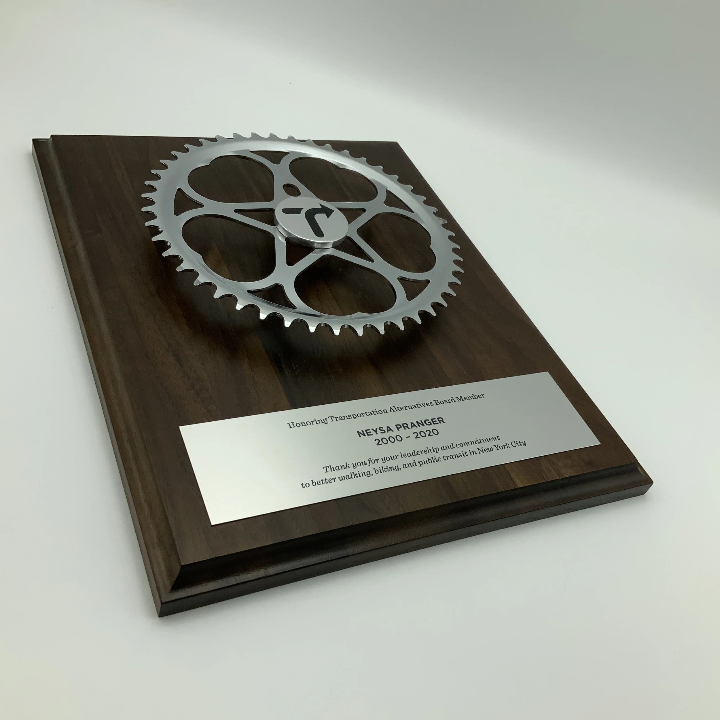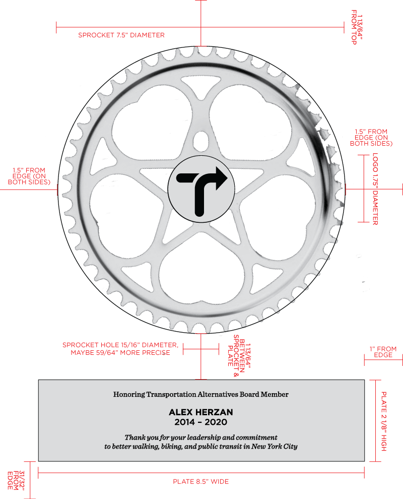 Transportation Alternatives’ Executive Director wanted something custom and special to thank Board members who were leaving the Board, some after two decades or more of service. From preliminary sketch to execution, I art directed and project managed these awards in collaboration with fabricator Fabberz. Photos of final products, process shots, and sketches are included. The last sketch here is my “idea” sketch. This multi-part multi-vendor award features a “Sweetheart Sprocket,” logo-engraved stainless steel disc, and name plate on a walnut plaque.