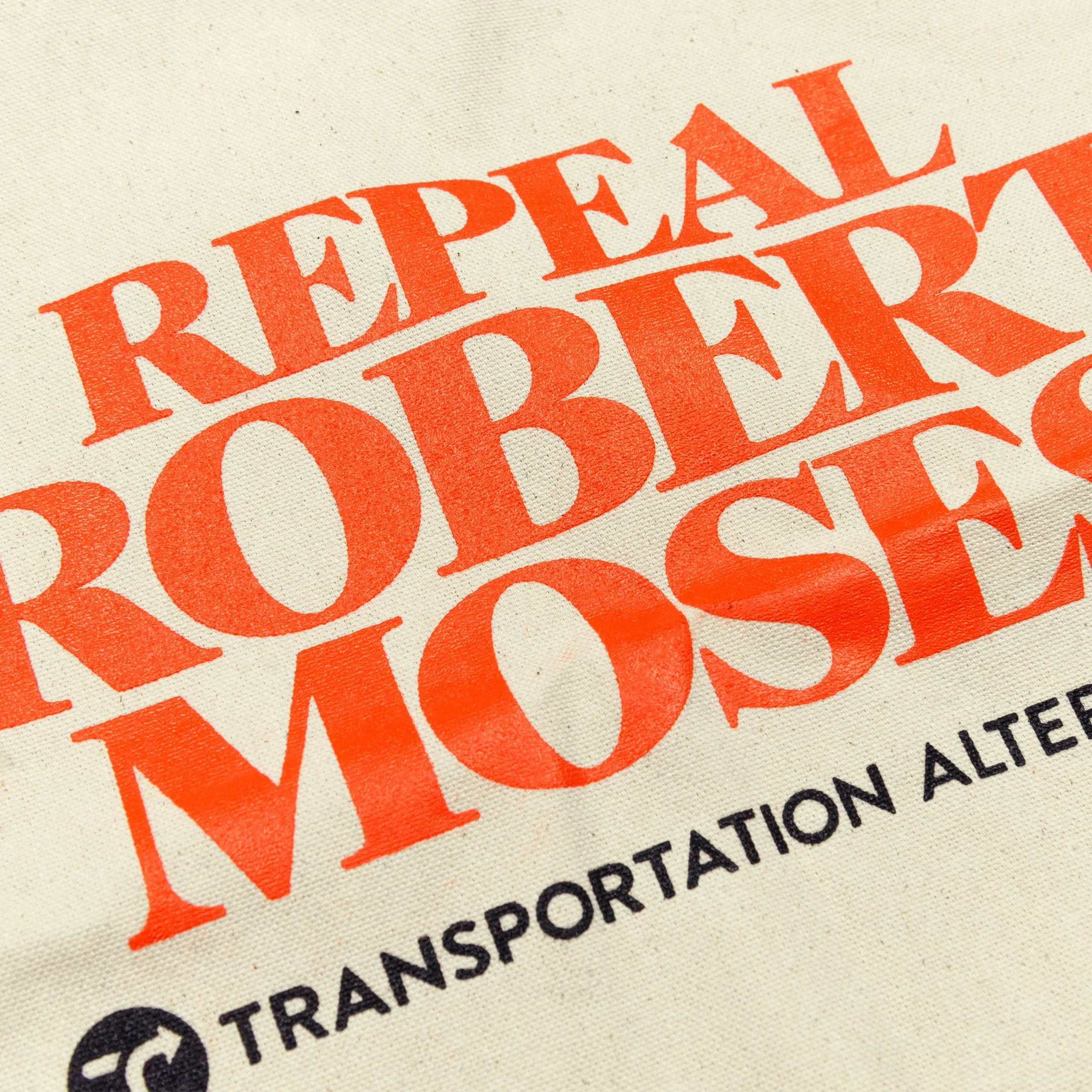 Design influenced by the cover of the book The Power Broker by Robert Caro, text reads “Repeal Robert Moses,” a direct commentary on the way Robert Moses’ racist policies split up New York City, displacing BIPOC and low income residents in order to build highways. This tote bag is featured in the “Turn Every Page”: Inside the Robert A. Caro Archive exhibition at the New York Historical Society in Manhattan.