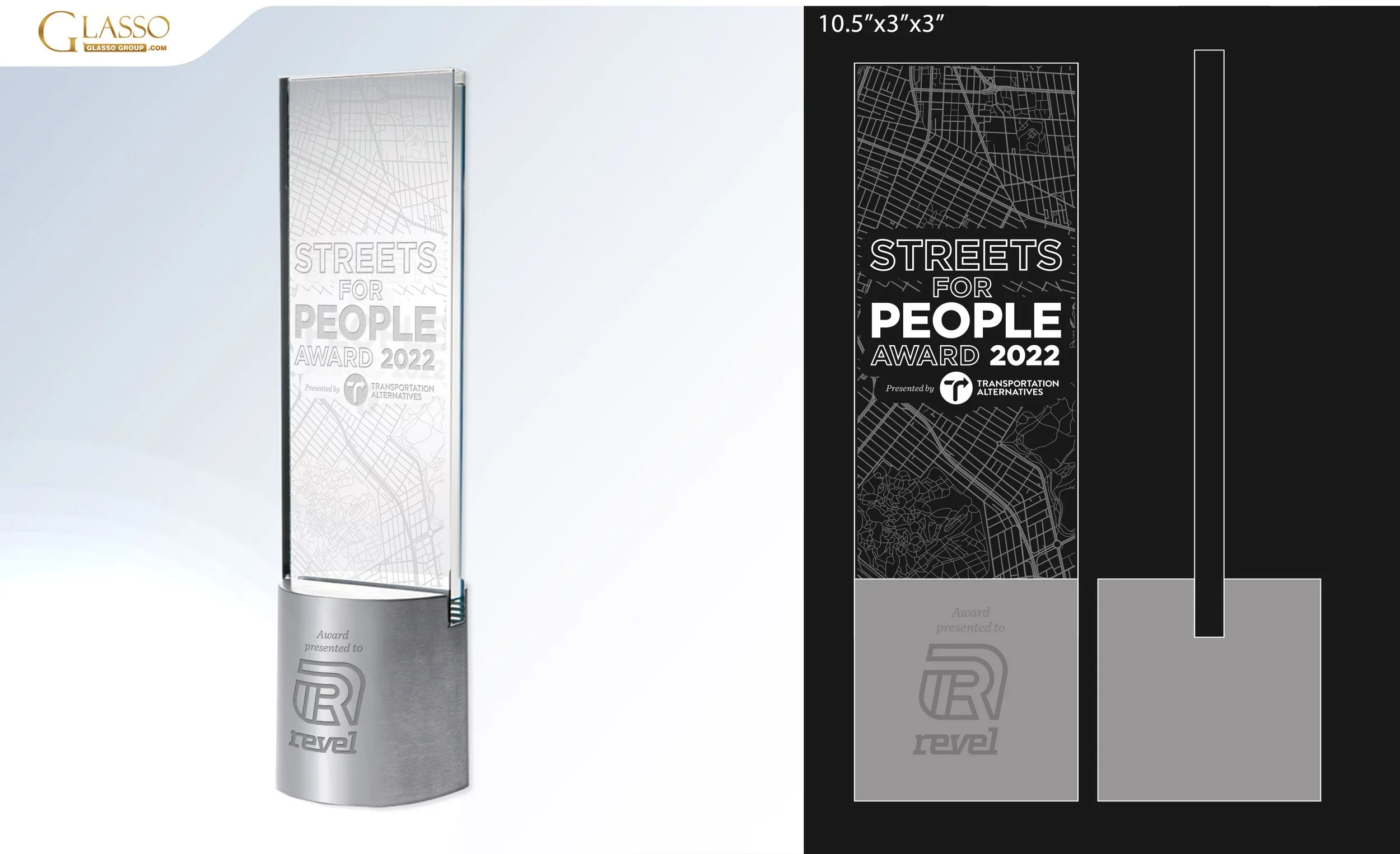 Transportation Alternatives honors someone with the Streets for People Award each year at their annual benefit. The recipient here was Revel Scooters. We chose to use a map grid of Brooklyn because that is where Revel began. From preliminary sketch to execution, I art directed and project managed this award in collaboration with Glasso Group. I chose to have the map laser-engraved and award name and logo sandblasted onto the glass to create a relief effect. The recipients were laser-engraved on the metal base. This was the final mockup prior to production.